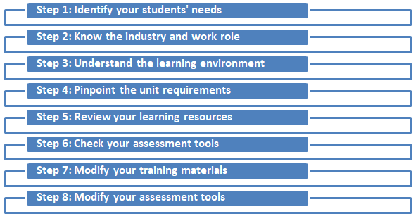 Contextualisation is an important process in the context of training resources. It involves making learning and assessment tasks relevant to a person’s specific experience in their workplace, job role, and industry sector. It means adapting resources purchased from an RTO provider such as units of competency or qualification packages to meet the needs of a given environment or enterprise. This requires tweaking and modifying generic resources so that they are suited to the social, cultural, business requirements in addition to any specific legislative and regulatory aspects related to that industry sector.