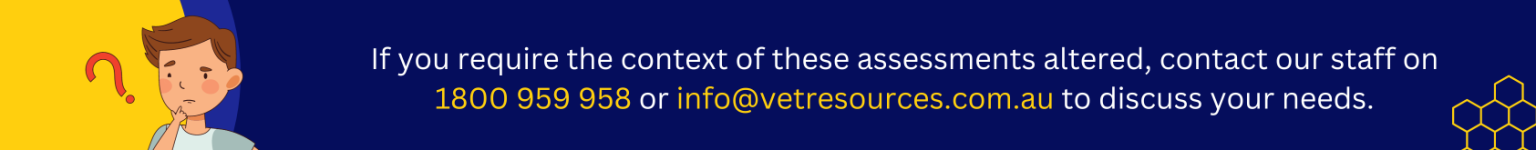 - Demonstrations and observations kit with practical tasks, for the assessor. This document includes different practical tasks relevant to the unit. Assessor will provide relevant tasks to students to perform, and the assessor will observe and record the performance.